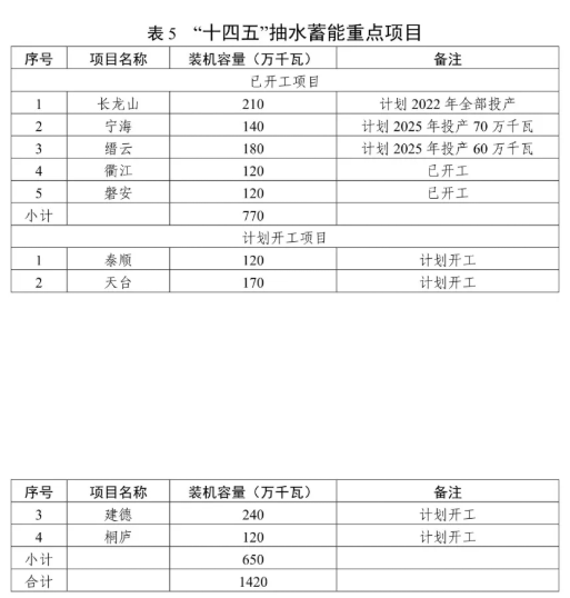 有序發展抽水蓄能電站。積極推進長龍山、寧海、縉云、衢江、磐安等抽水蓄能開工項目的建設,穩妥開展泰順、天臺等抽水蓄能電站項目前期工作,適時啟動建德、桐廬站點的前期工作。結合現有站點,合理規劃布局,積極推動新一輪抽水蓄能電站選點工作。加強抽水蓄能電站建設管理體制、電價機制等研究。"十四五"期間,全省抽水蓄能電站力爭新增裝機容量 340 萬千瓦,累計裝機容量達到798 萬千瓦。