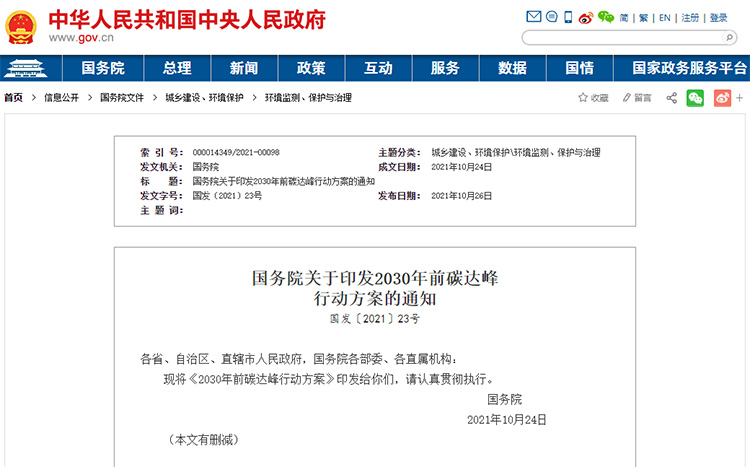 國務(wù)院關(guān)于印發(fā)2030年前碳達峰