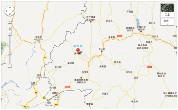 云南騰沖縣位于云南省西南部,西部與緬甸毗鄰,歷史上曾是古西南絲綢之路的要沖。地理座標為東經98°29’,北緯25°1’。